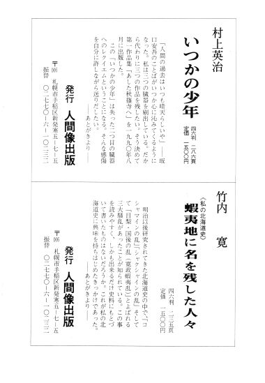 にぎわい始めた入口を見つめて美奈が思い出にふけっていると一時間ほどして、美奈の不安を打消すように李枝はオリーブ色のスーツをビシッと着こなしてさっそうと現れた。美人とはいえ、コタンの匂いを感じさせ、周囲の人々から好奇の視線をあびせられたり、美奈自身もコタン出身を教室のメンバーから、特別のまなざしをむけられるのでは? などと心配になっていた自分が、むしろ恥かしくなった。 美奈は嬉しくなってかけより、手をとって 「しばらくう、よく来てくれたわねえ、うれしい、逢いたかったあ」 (佐藤瑜璃「忘れな草」)