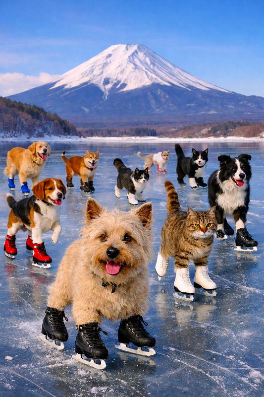 散歩に行って心筋梗塞なんてことになったら嫌なので散歩はパスしています。その代わり夕方にもう1度階段を歩いています。写真も無いのでまたA!に富士山の見える湖で動物たちがスケートしてるところを描いてもらいました。種を超えて仲良くできたら人間社会も平和なのにです。