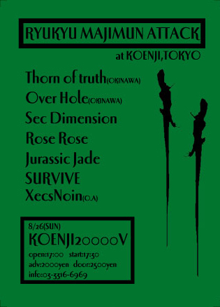 Act Thorn of truth(OKINAWA) Over Hole(OKINAWA) XecsNoin Sec Dimension(KANAZAWA) Rose Rose Jurassic Jade SURVIVE open:17:00 start:17:30 adv:2000yen door:2500yen info:03-3316-6969(20000V) backatack@t.vodafone.ne.jp(hidemi)