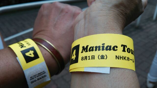 マニアック・ツアー@NHKホール (Aug. 1' 2014) 昨日行ってきましたぁ〜@(^−^) 一言でいうと・・「達郎さんの男気に惚れてまうやろ?」という感じ。 言葉で語らず・・パフォーマンスで全力で表現するという…。 決して陳腐ではなく、上質な世界。。素晴らしい〜@ 私の切望の曲も・・いろいろと勝手に妄想して感無量(T_T)(をいをい) ヒット曲無しのライブでしたが、あれはあれで完成度高いライブでした。 「どんだけ埋もれた(披露出来なかった)名曲が多いのか?」というのは失礼かもしれないけど、、 今まで披露出来なかったものを、今回聴くことが出来て良かったです。(T_T) まさか?のあの曲! うそでしょ?のその曲! あり得えん?のこの曲!を聴けました。 本当は↑にタイトル書きたいくらいだけど・・これからの方々は楽しみにしてくださいね。 さて、 ↓の黄色のリストバンドはチケットの氏名と身分証明の確認後に係の方に着けていただきました。四本目の公演だから「4」と入っているかもね? 同行の方は石垣焼けで…腕がこんがり小麦色。