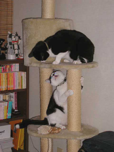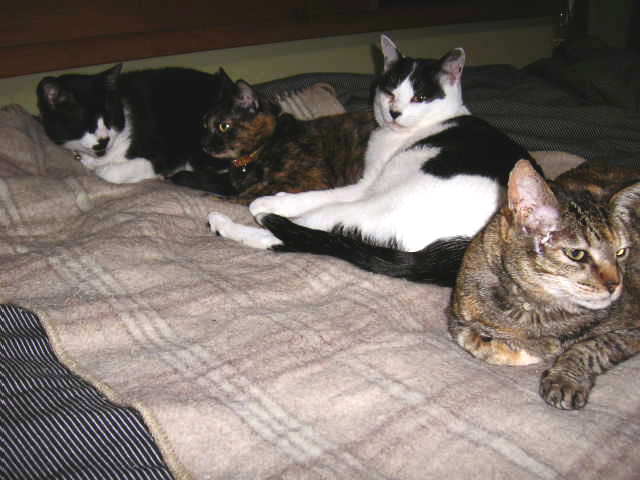 さて写真ですが、我が家の4にゃんの就寝時の様子です。 隣に夫の布団もあるのですが、み〜んな私の足元で寝ます。 やっぱり寝るときはカァチャンのとこなのねーと 自己満足に浸る瞬間です。重いですが。 こんな時でも、リュウノスケとウメは一番距離をおいています。 抜け目ないです。 |