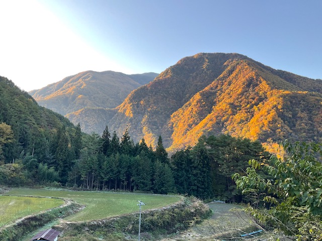 写真は、昨年11月に「延齢草」に泊まった翌朝の青田山(1707m)。この山を見ると大鹿村にやってきたなあと思えました。