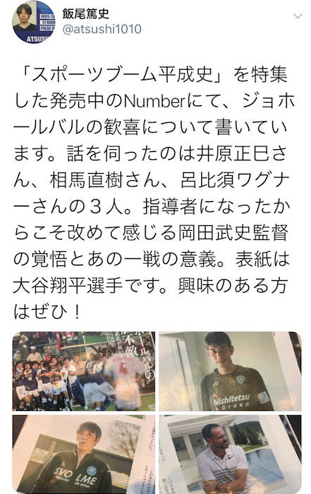 「スポーツブーム平成史」を特集した発売中のNumberにて、ジョホールバルの歓喜について書いています。話を伺ったのは井原正巳さん、相馬直樹さん、呂比須ワグナーさんの3人。指導者になったからこそ改めて感じる岡田武史監督の覚悟とあの一戦の意義。表紙は大谷翔平選手 | |||