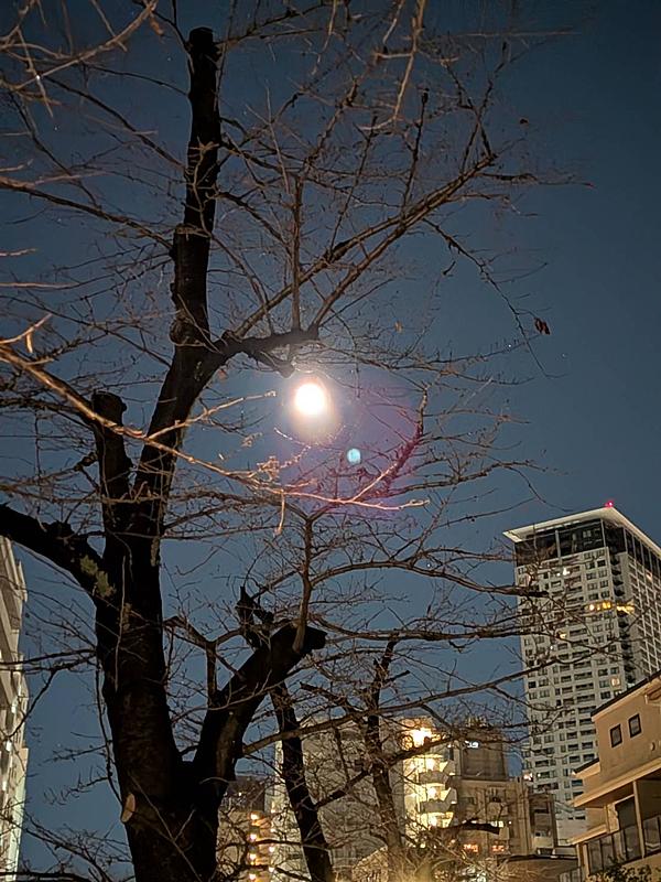 年末から年始にかけ冷え込んでいたが、今朝は思いのほか空気が冷たく、緩んでいた気持ちが引き締まった。茶屋坂を下り始めた途端、上空にはウルフムーンと呼ばれる