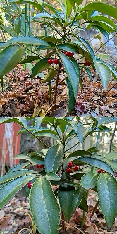 キャンパス内に“万葉の小径“と名付けられた幅1.0~3mで飛び石や平板敷石の小径があり、万葉の植物などが植えられているのだが、隣にマンションが出来た影響で陽が当たりにくくなり、万葉の植物が無くなりつつある。小径の最後の植え込みには大学側で植えたハズもないのに赤い果実が下に向かって付いた万両が3〜4株ほど見つかった。