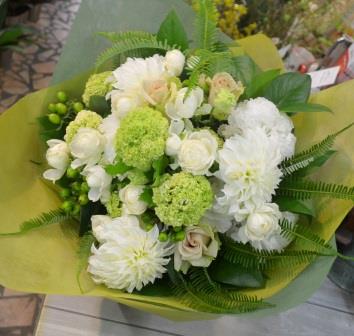白と緑で素敵な花束を作っていただきました。