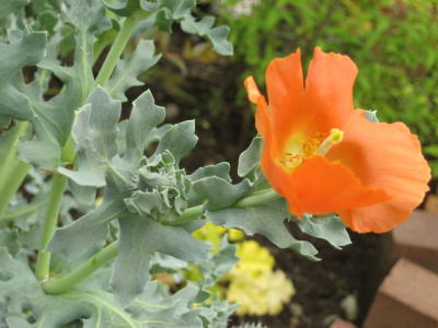 写真の花・・・ポピーに似ているでしょう? てっきり他の葉っぱの間からポピーが出てきたのかと思っていたら、 この葉っぱの先に咲いているのです〜 去年めずらしくて買って植えてみたものなのだけど 名札も何処え〜〜!? 名前がわかりませ〜ん(ノ_・、) それとあのオレンジ色のポピーの名前がわかりました! 「ナガミヒナゲシ」と言うのだそうです。 スッキリ、スッキリ〜!!(*⌒ー⌒)